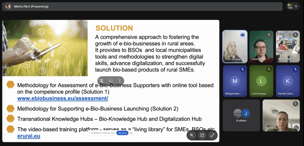 18. märtsil toimus eRural Resilience projekti raames veebipõhise tööriista tutvustusseminar, kus partneritele esitleti uut online-tööriista, mis toetab maapiirkondade väikeettevõtteid e‑bioettevõtlusega alustamisel või arendamisel. Tööriist tugineb projekti raames välja töötatud e‑bioettevõtete käivitamise metoodikal (Solution 2).